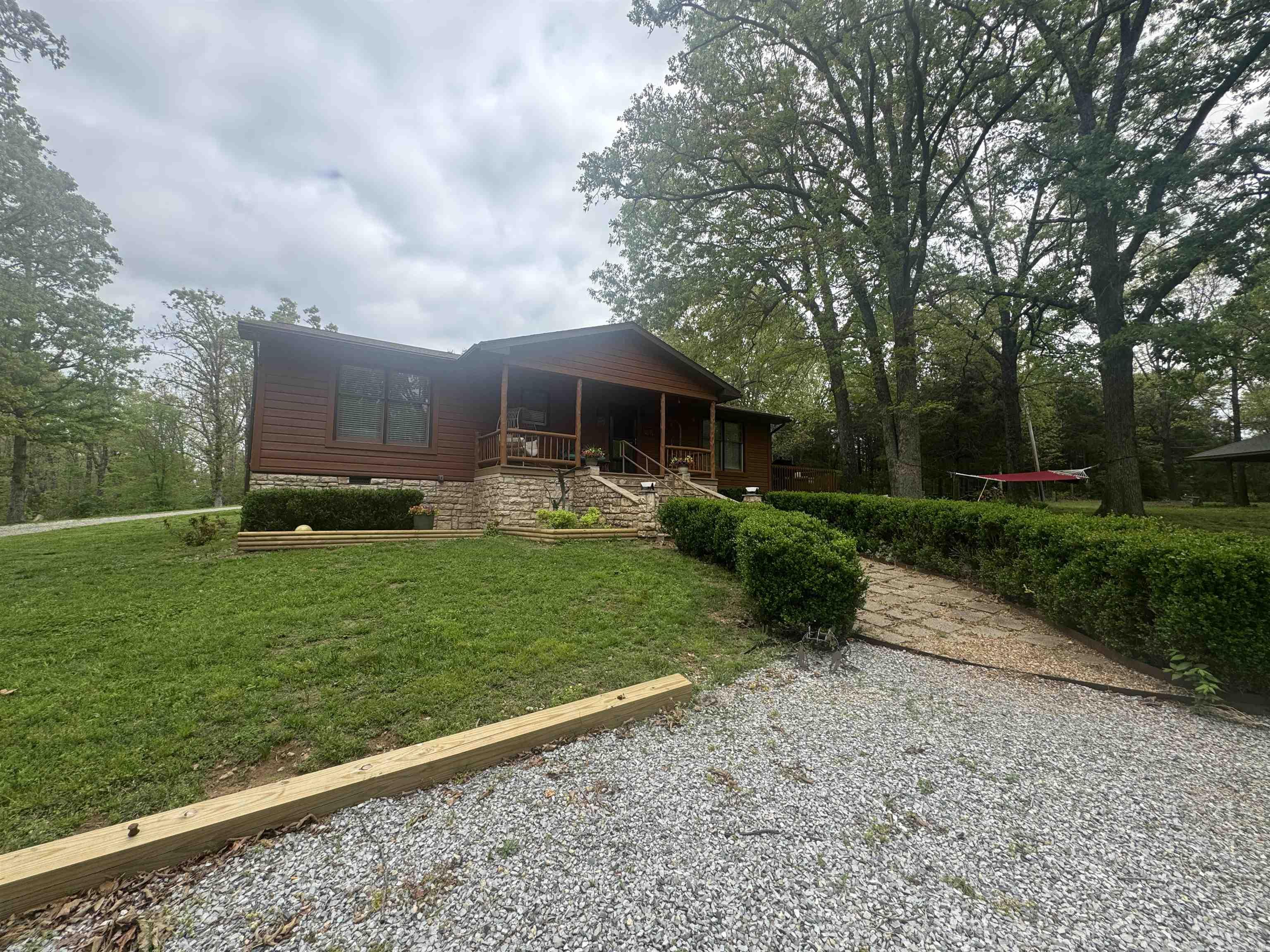 Experience a peaceful, park-like setting on 5 AC M/L acres, located less than 10 miles from the White River and Bull Shoals Lake, and under 5 minutes to the Howard Creek access. This well-maintained 3-bedroom, 2-bath home features an inviting open floor plan with beautiful maple kitchen cabinets, a breakfast bar, and all new appliances. The living room offers a cozy wood stove accented by an attractive stone veneer heat shield. An extra-large laundry area provides ample space for a freezer and additional storage. Enjoy outdoor living with a large side deck, a covered front porch, and a covered outdoor kitchen with a dedicated dining area. The updated bathrooms include a spacious walk-in shower in the primary suite. Outside, the property includes an Arkansas-style cabin that could serve as a playhouse or be finished as a guest space, a chicken/bunny house, and a commercial-size greenhouse. Surrounded by mature trees for added privacy. Offered at $398,000.